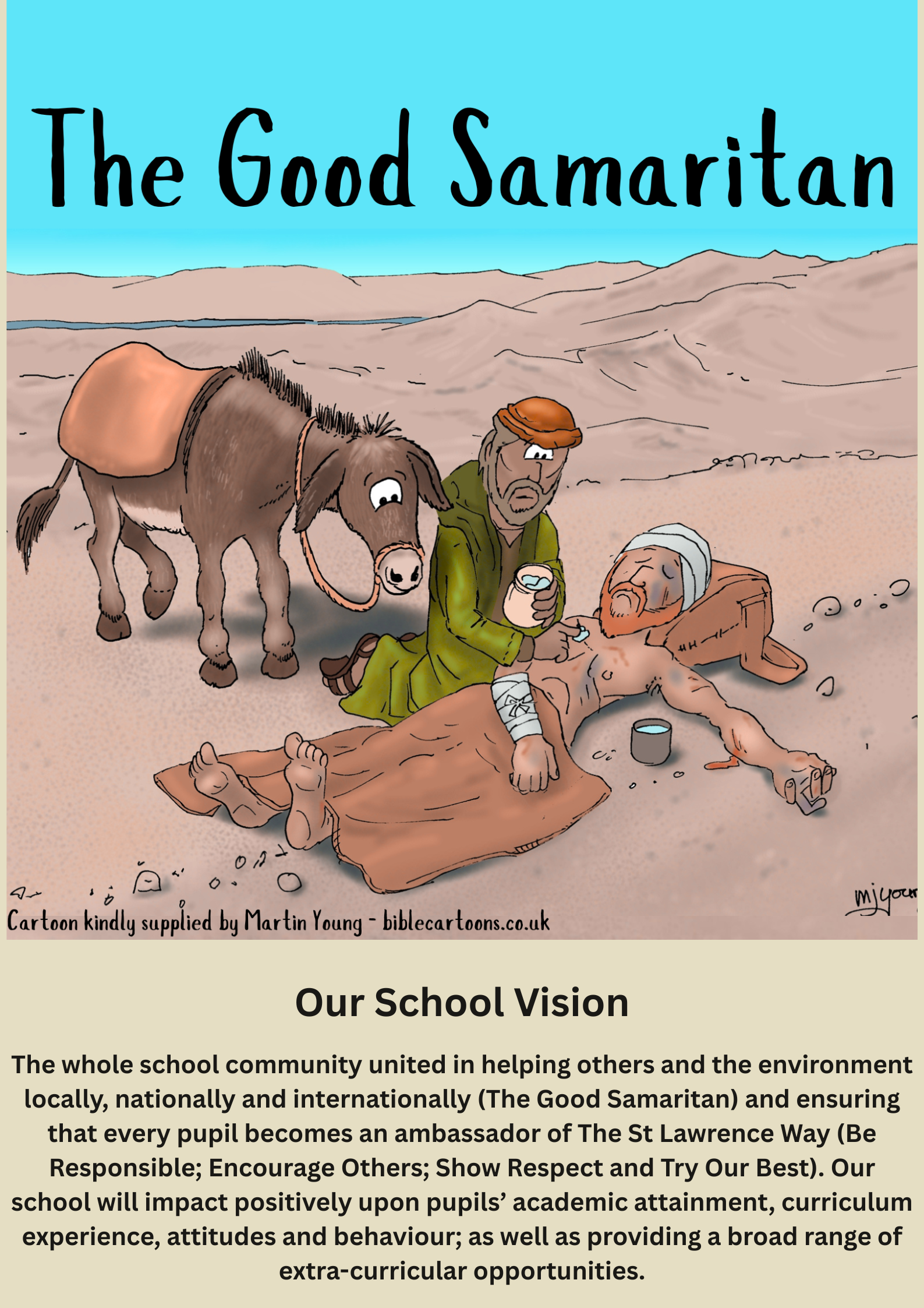 "The whole school community united in helping others and the environment locally, nationally and internationally (The Good Samaritan) and ensuring that every pupil becomes an ambassador of The St Lawrence Way (Be Responsible; Encourage Others; Show Respect and Try Our Best). Our school will impact positively upon pupils’ academic attainment, curriculum experience, attitudes and behaviour; as well as providing a broad range of extra-curricular opportunities."